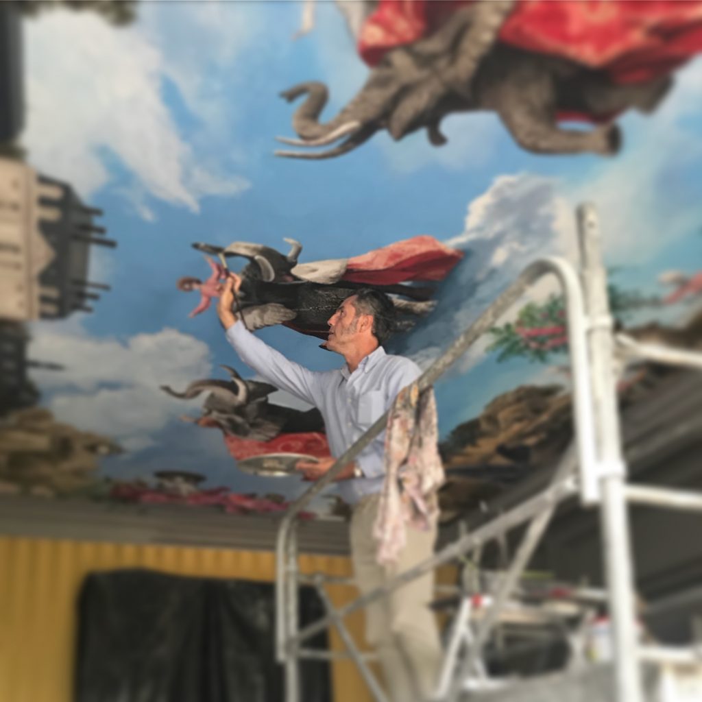 Uno de mis trabajos más apasionantes de los últimos años ha sido concebir y pintar el gran lienzo que preside el techo del comedor del Château Le Fresne, en el Valle del Loira, Francia.