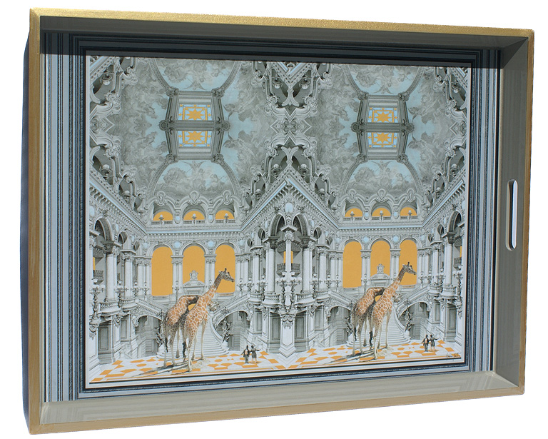 Una composición monumental y simétrica, habitada por jirafas que caminan entre columnas y escaleras palaciegas. Un guiño al absurdo en medio de una arquitectura impecable. Arte y humor sutil sobre una superficie funcional.