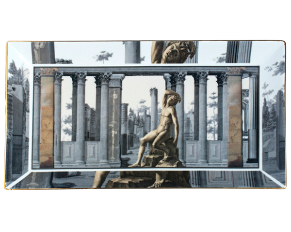 Un fauno sin prisa recorre las ruinas Pompeyanas, doradas por el filo de la porcelana. Inspirada en los papeles pintados que diseñe para la Biblioteca Nacional de España, esta bandeja no solo sirve —también observa.