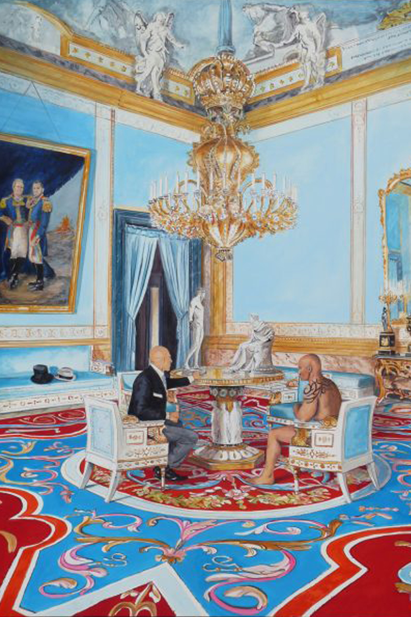 Una escena íntima, casi doméstica, en la que el pasado imperial y el presente tatuado comparten salón, mobiliario de época y cierta incomodidad silenciosa. El lujo palaciego se mantiene intacto, aunque ahora la realeza parece venir en clave de contraste cultural y estética disonante. ¿Una cita diplomática? ¿Una terapia de pareja? Quién sabe. Lo importante es que ambos están sentados… y el candelabro sigue en su sitio.