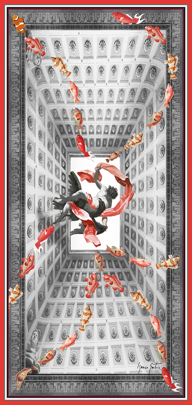 Motivo inspirado en la obra mural que Ignacio Goitia creó para Casa Decor 2026, en colaboración con la interiorista Verónica Montijano. Un lobby manierista donde los peces iconográficos del artista dialogan con esculturas de mármol y dispositivos reflectantes que producen ilusiones ópticas. Arte habitable trasladado al textil.